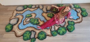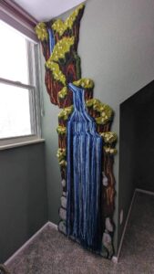 Description: Designed for a Private residence in Denver, CO, this tufted waterfall installation hides a secret cave opening behind the latch-hook falls. Moss covered rocks, moss tufts, and a 3D ‘Plushroom’ grace the inside, with a full waterway rug planned for inside the cave.
