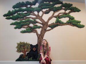 Forest Sanctuary: Floor to ceiling 10’ foot tall Monterey Cypress Trees, featuring native plants and animals, transform an interior corridor into a tranquil woodland path. Embodying the resilience and perseverance of our local Coastal Cypress trees, this installation allows interaction with various textures and provides sound-proofing.
